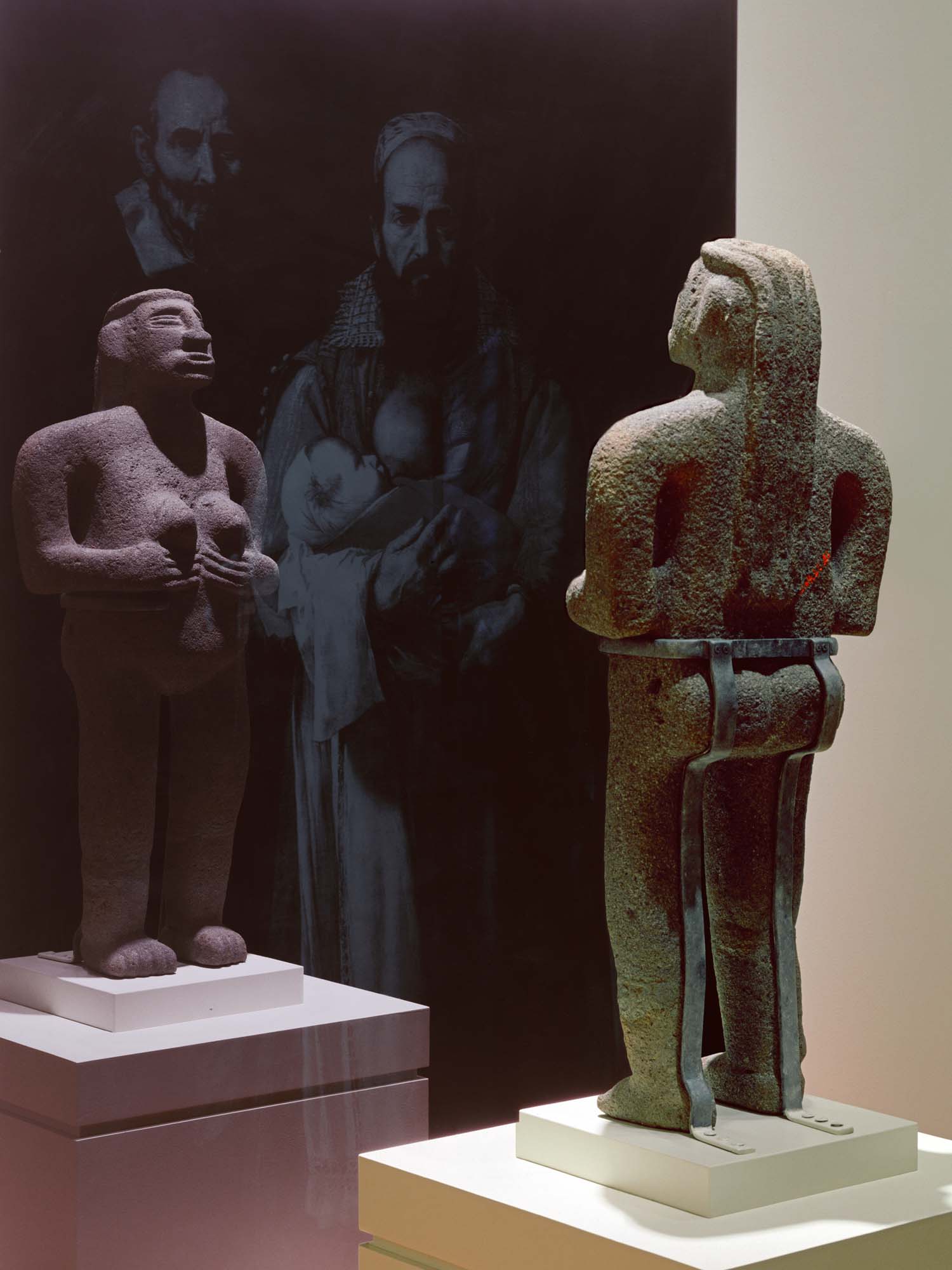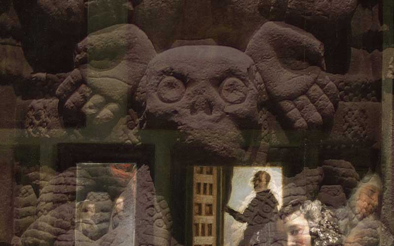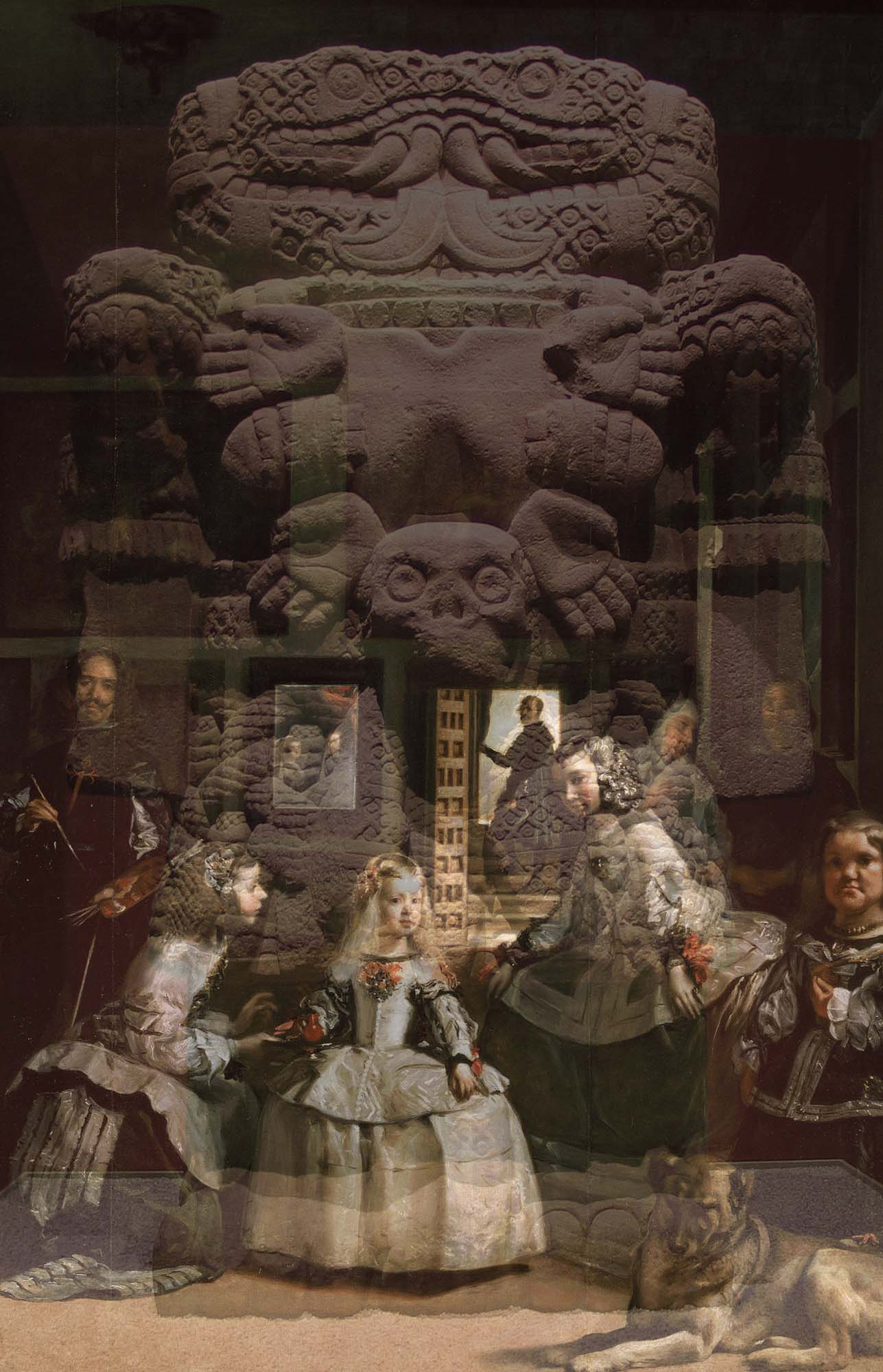 The Black Mirror series began when the Nasher Museum of Art commissioned a new work to accompany their exhibition From El Greco to Velázquez: Art during the Reign of Phillip III. The Black Mirror / Espejo Negro book includes thirty-nine photographs of the installation, as well as critical writings by scholars of various disciplines. The series as a whole, with its play of transparencies and reflections, makes impossible any separation between past-present, artwork-viewer-environment, or the pre- and post-Columbian. Coatlicue and Las Meninas, however, is the most iconic demonstration of the modernity/coloniality union. The work proposes two temporary installations. The first would bring the Aztec sculpture Coatlicue to the Museo del Prado in Madrid to display it in front of Las Meninas by Velázquez. The second would transport Las Meninas to Mexico City to be displayed in front of the Coatlicue at its habitual home, the National Museum of Anthropology. Both installations would include a large sheet of dark glass hovering between the works, integrating again--through transparencies and reflections--the artworks, their viewers, and their contexts. Not to be confused with the modern notion of mestizaje, these reflections allow the perception of simultaneous difference, copresence, and cotemporality.