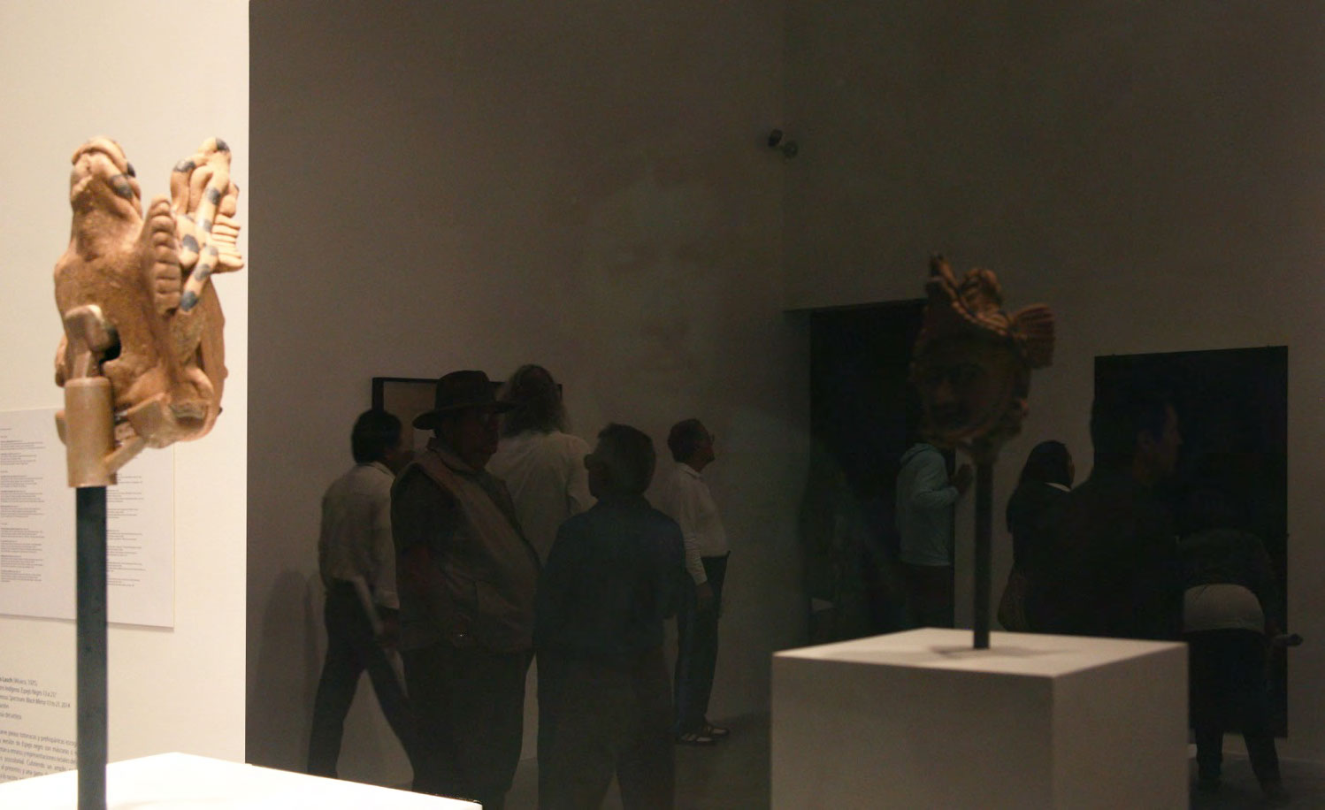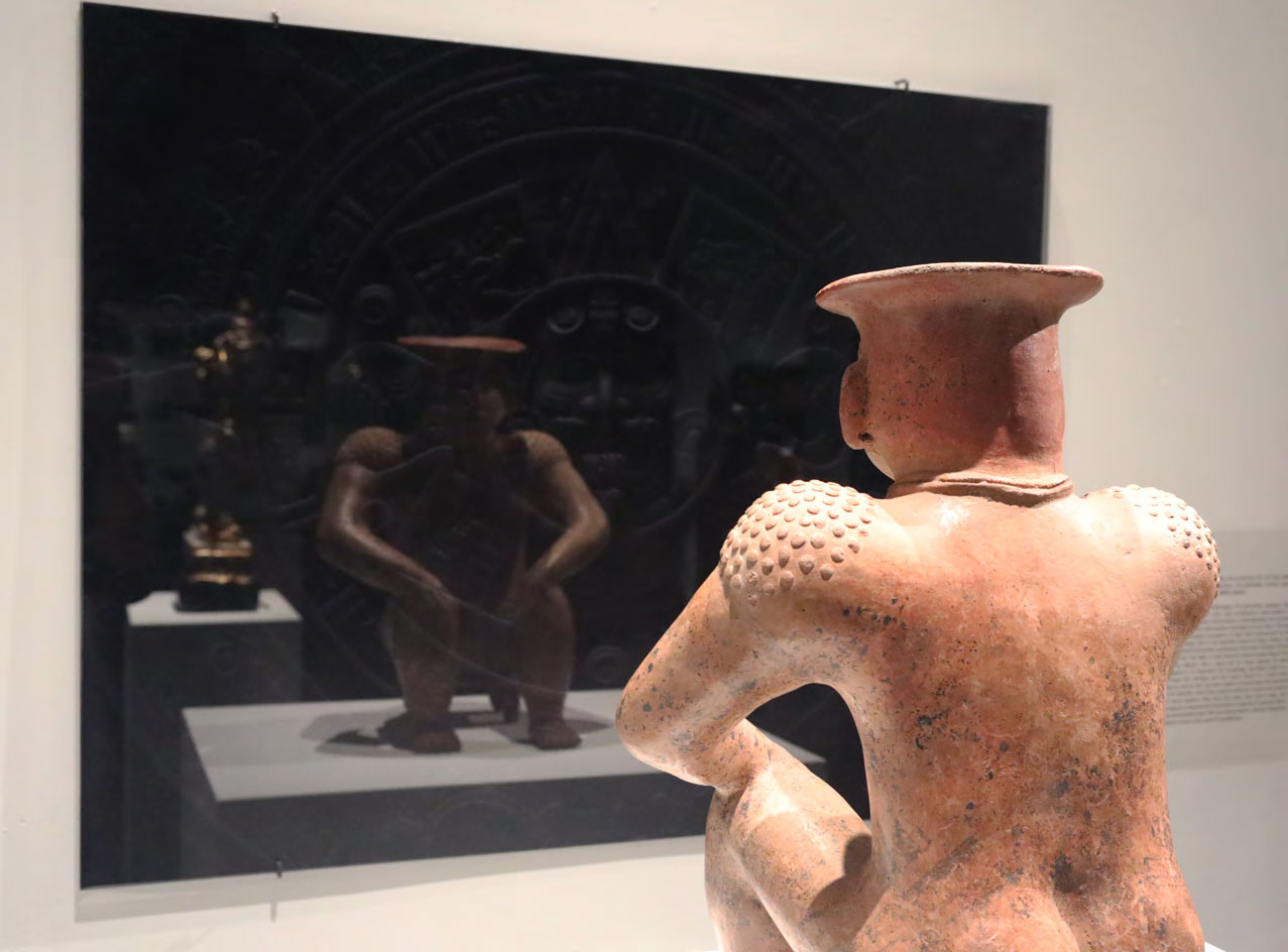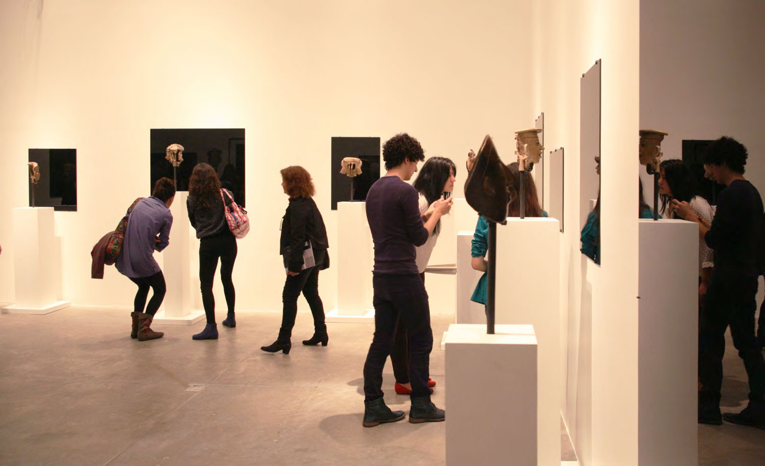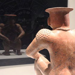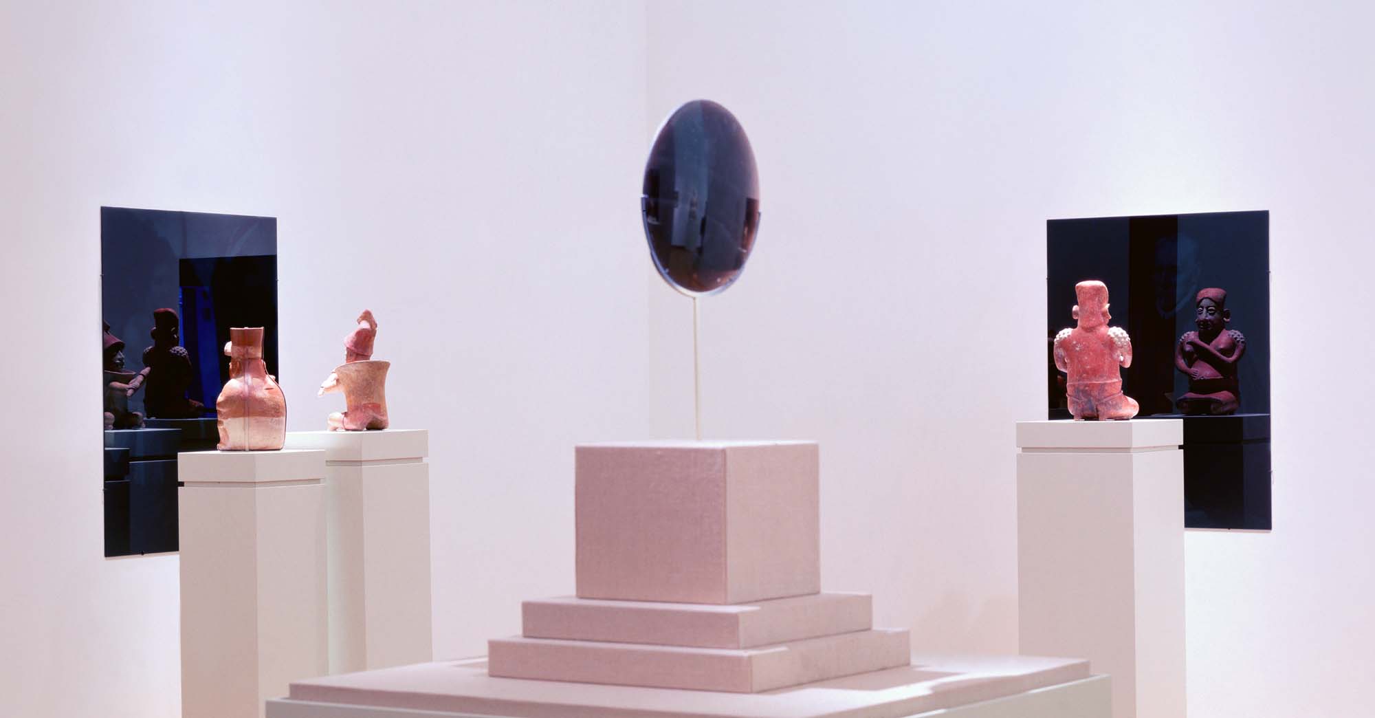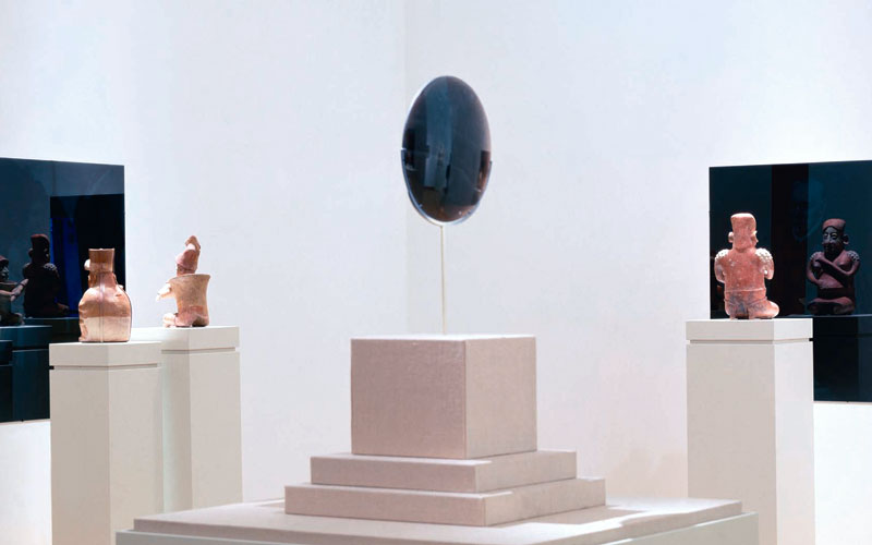Produced specifically for the MUAC in Mexico City and incorporating pre-Colombian works from the UNAM’s own collection, Indigenous Spectrum is a new large scale museum installation from Pedro Lasch’s Black Mirror/Espejo Negro series. The first installation in the series focused on coloniality at large and was commissioned by the Nasher Museum of Art to accompany its blockbuster exhibition El Greco to Velazquez. Lasch selected sixteen figures from the museum’s permanent collection of pre-Columbian art, and placed them on sculpture pedestals with their backs turned to the viewer. In front of the figures hung large, rectangular black mirrors, reflecting the fronts of the sculptures. After prolonged viewing, ghostly images of Spanish baroque paintings emerged from behind the dark sheets of glass. Standing amidst Lasch’s installation, the viewer saw indigenous art, colonial representation, and his or her own face and body collapsed onto a single mirrored plane.