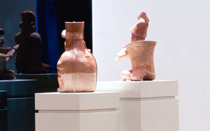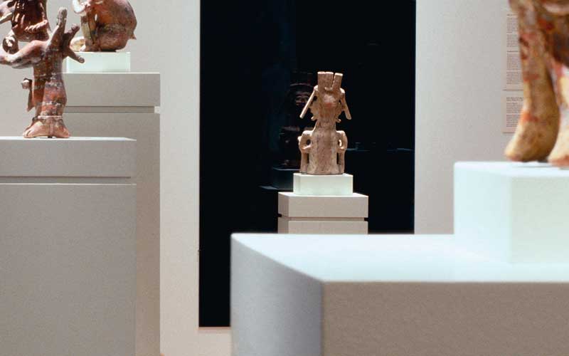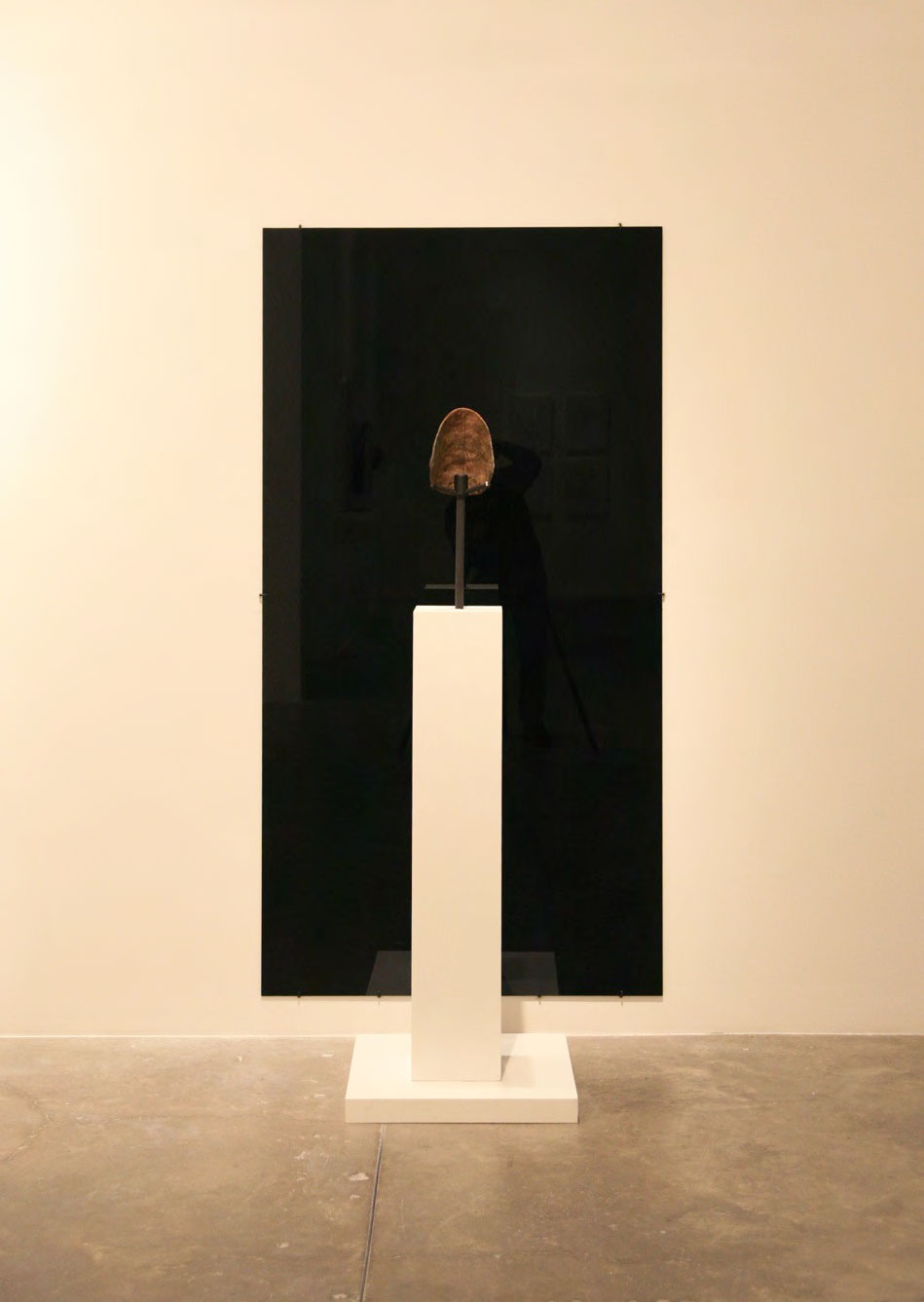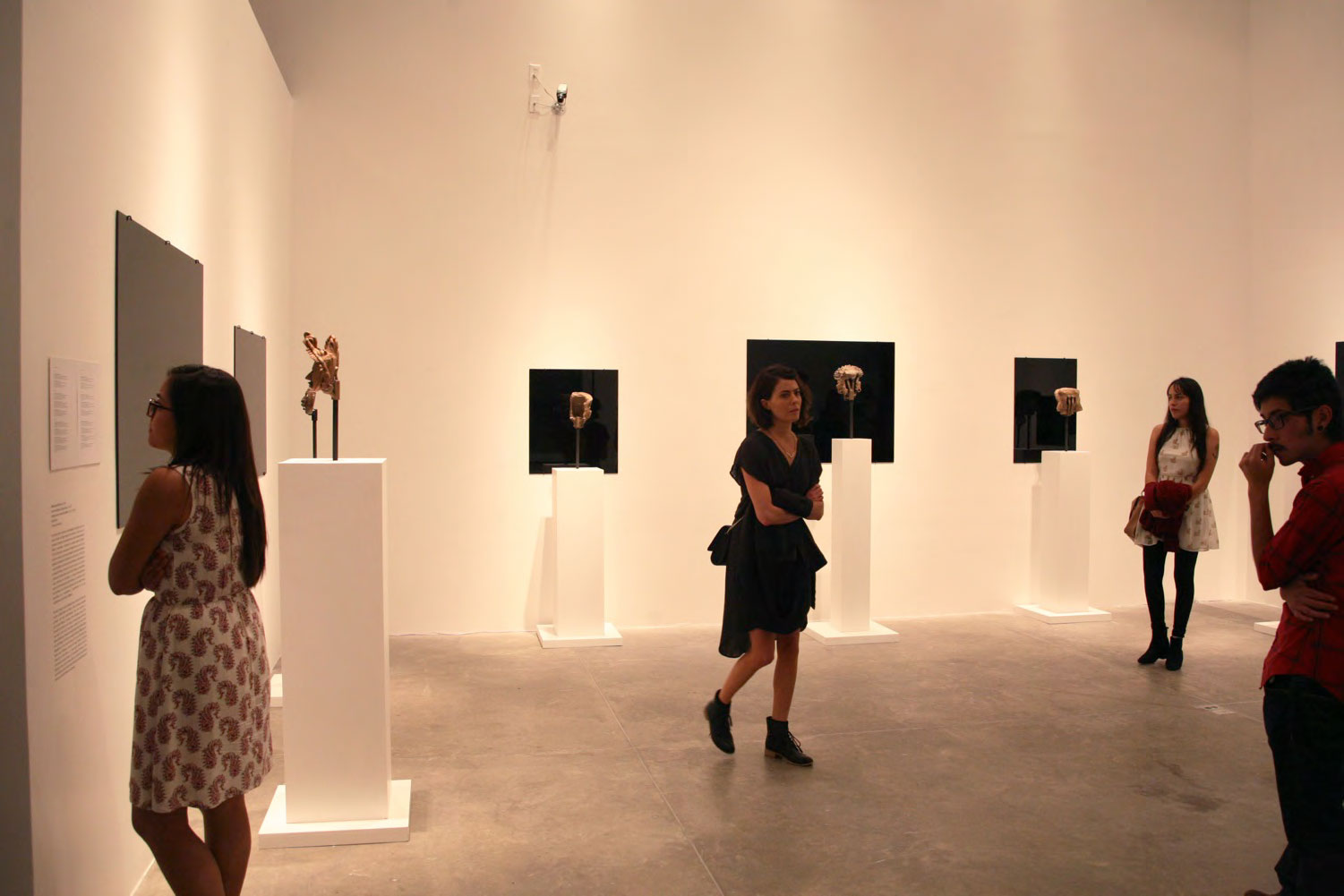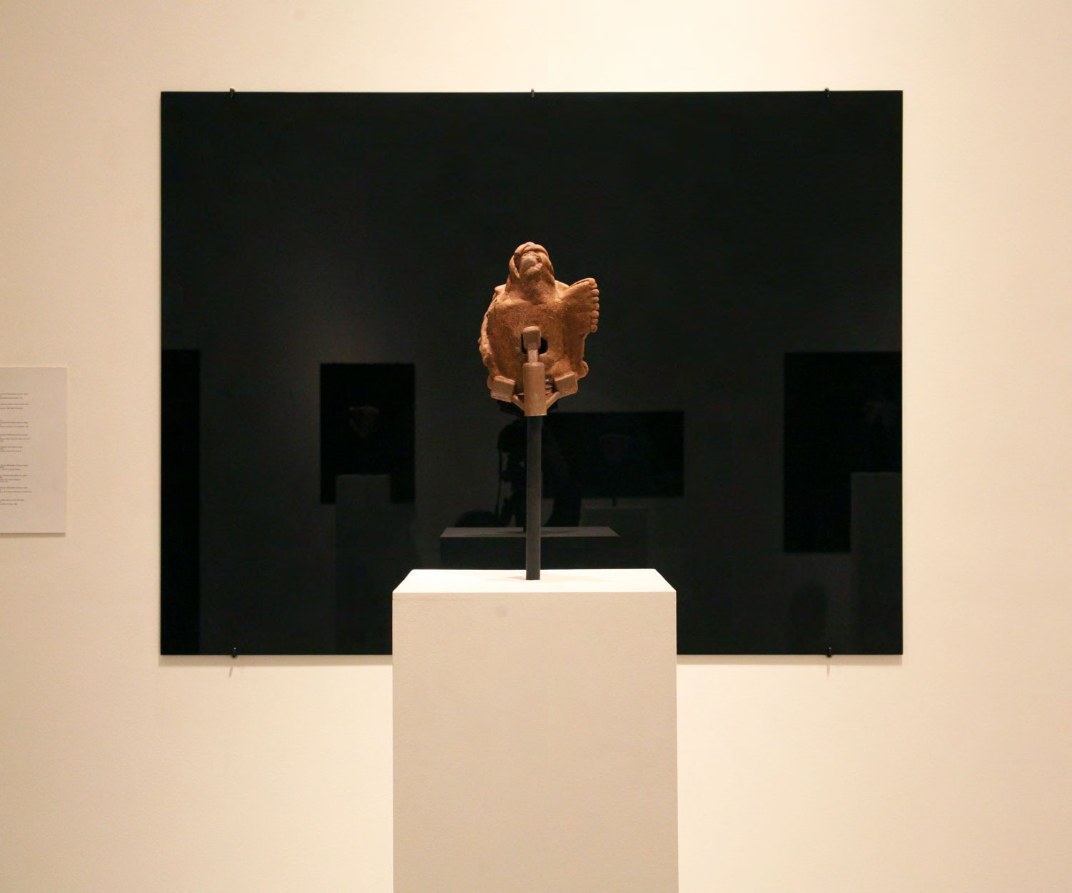 Produced specifically for the MUAC in Mexico City and incorporating pre-Colombian works from the UNAM’s own collection, Indigenous Spectrum is a new large scale museum installation from Pedro Lasch’s Black Mirror/Espejo Negro series. The first installation in the series focused on coloniality at large and was commissioned by the Nasher Museum of Art to accompany its blockbuster exhibition El Greco to Velazquez. Lasch selected sixteen figures from the museum’s permanent collection of pre-Columbian art, and placed them on sculpture pedestals with their backs turned to the viewer. In front of the figures hung large, rectangular black mirrors, reflecting the fronts of the sculptures. After prolonged viewing, ghostly images of Spanish baroque paintings emerged from behind the dark sheets of glass. Standing amidst Lasch’s installation, the viewer saw indigenous art, colonial representation, and his or her own face and body collapsed onto a single mirrored plane.