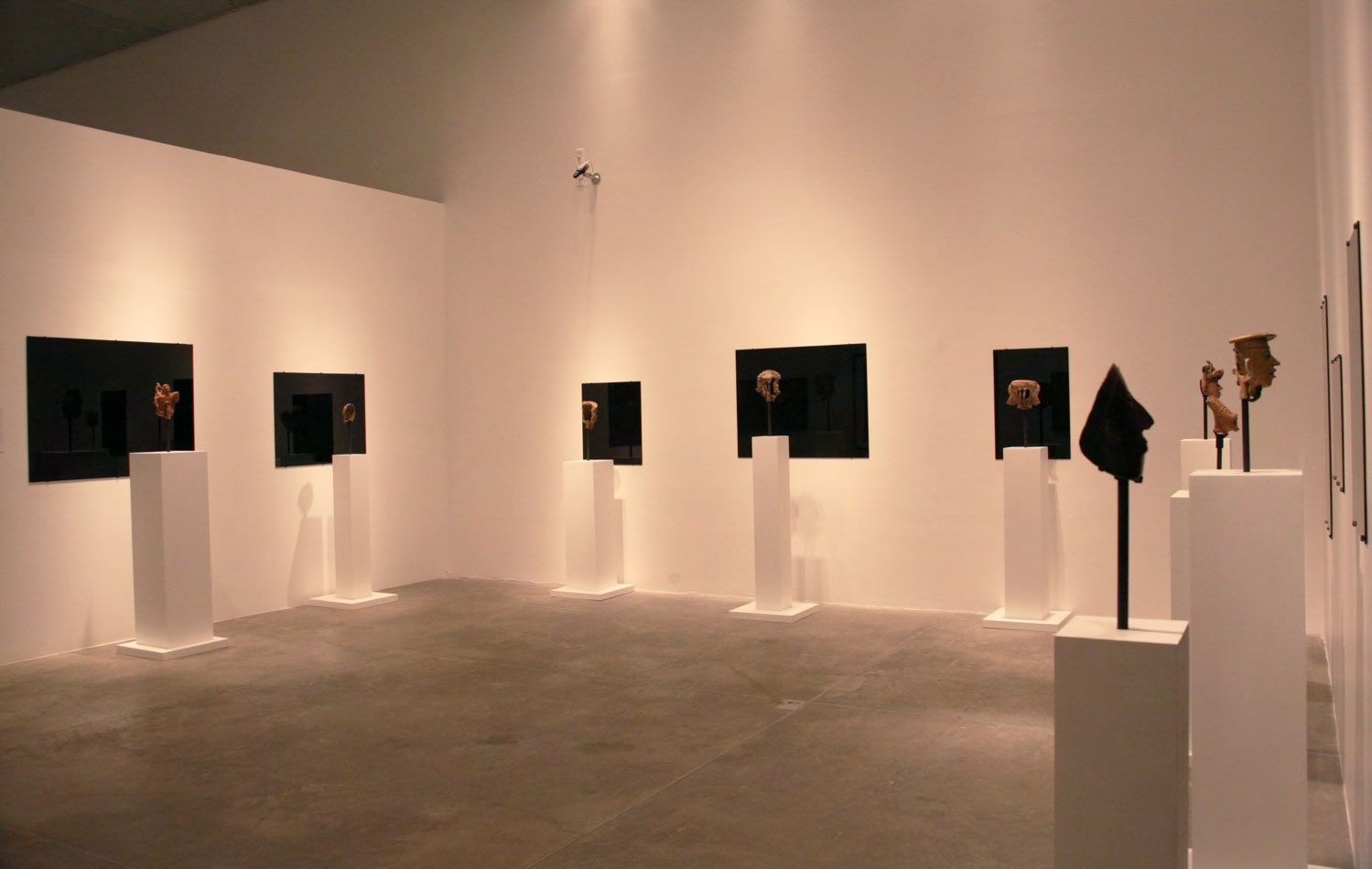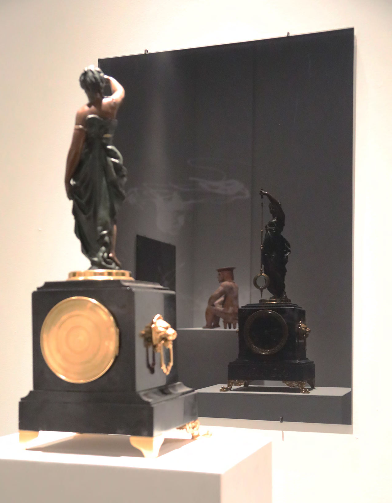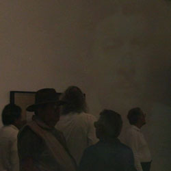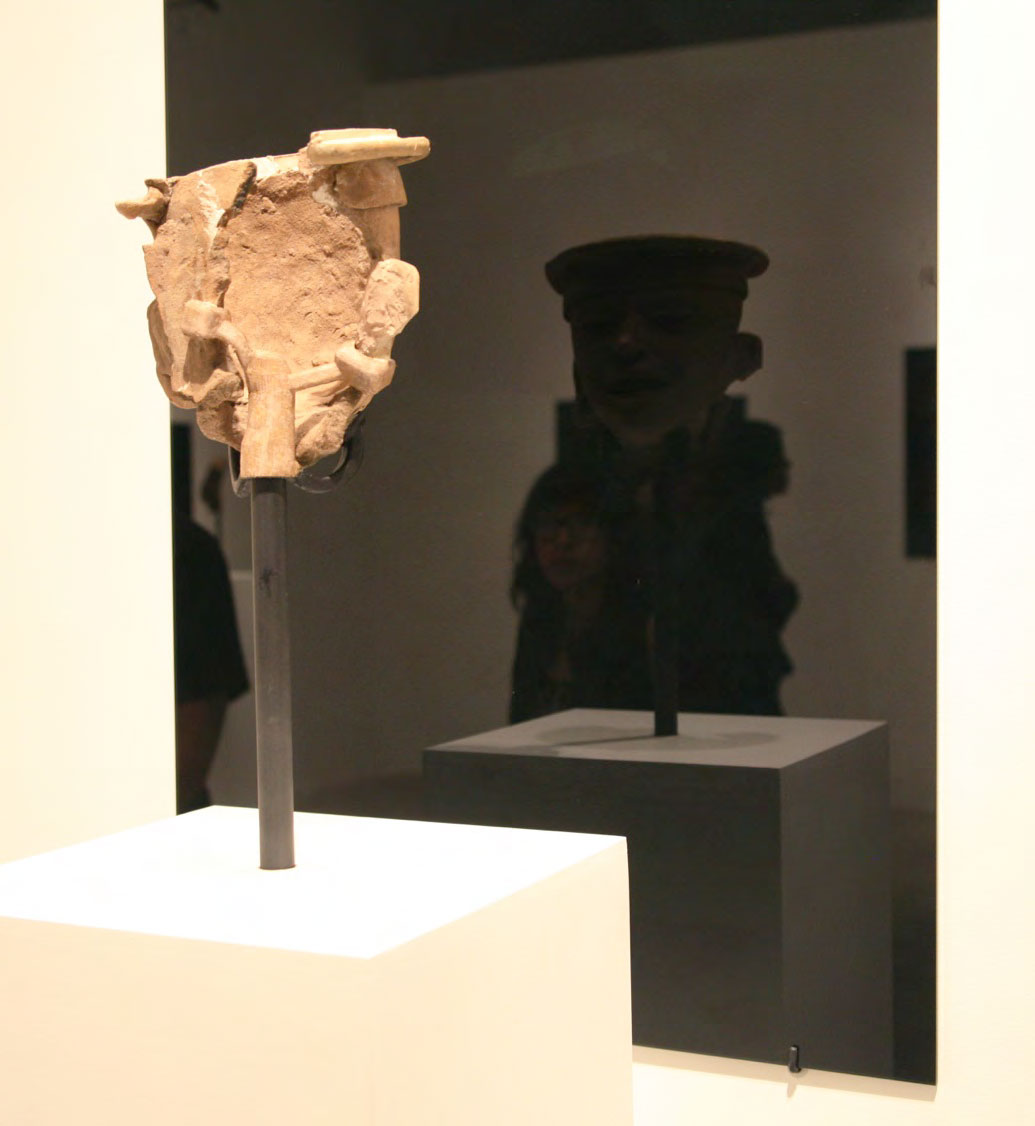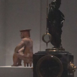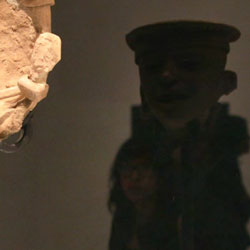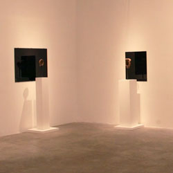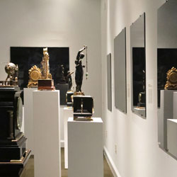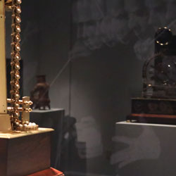 Black Mirror/Espejo Negro, Pedro Lasch’s large-scale museum installation, was commissioned by the Nasher Museum of Art to accompany its blockbuster exhibition El Greco to Velazquez. Lasch selected sixteen figures from the museum’s permanent collection of pre-Columbian art, and placed them on sculpture pedestals with their backs turned to the viewer. In front of the figures hung large, rectangular black mirrors, reflecting the fronts of the sculptures. After prolonged viewing, ghostly images of Spanish baroque paintings emerged from behind the dark sheets of glass. Standing amidst Lasch’s installation, the viewer saw indigenous art, colonial representation, and his or her own face and body collapsed onto a single mirrored plane.