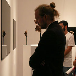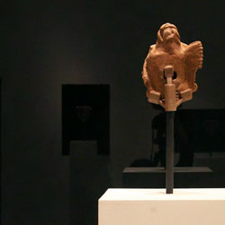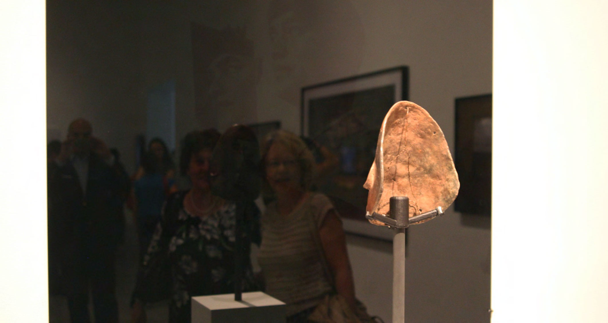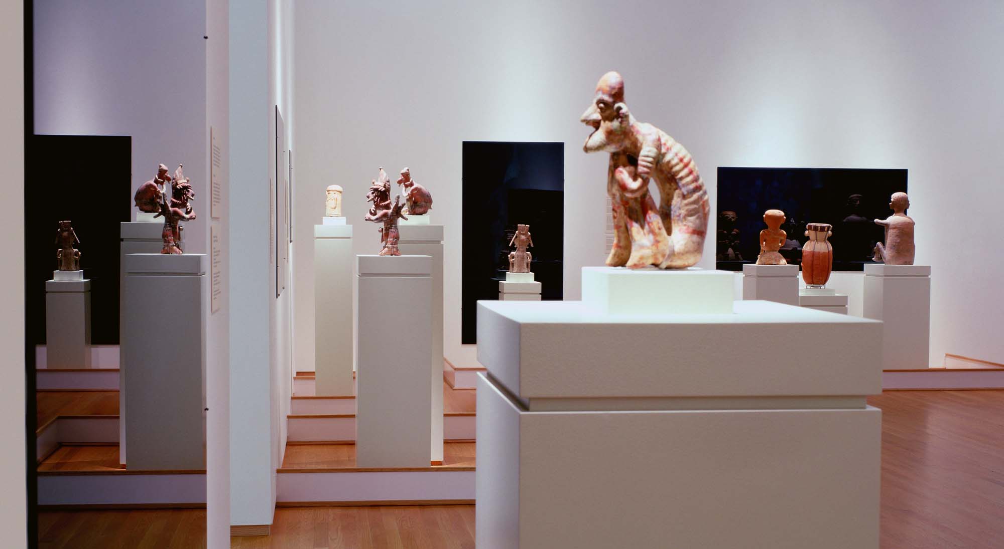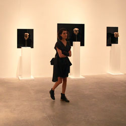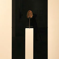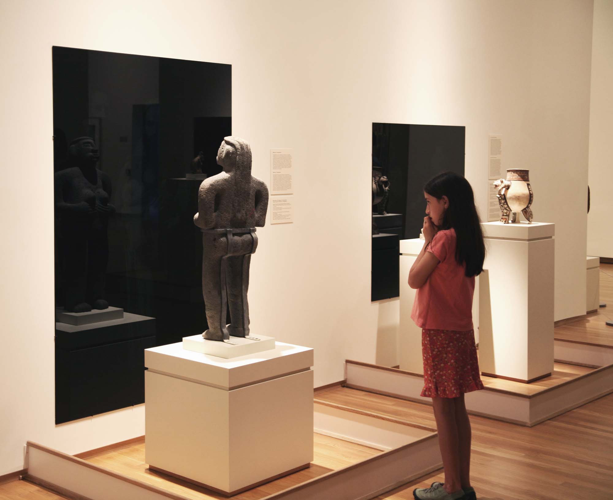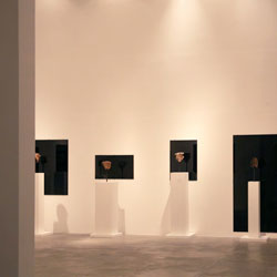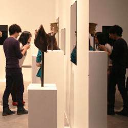 Black Mirror/Espejo Negro, Pedro Lasch’s large-scale museum installation, was commissioned by the Nasher Museum of Art to accompany its blockbuster exhibition El Greco to Velazquez. Lasch selected sixteen figures from the museum’s permanent collection of pre-Columbian art, and placed them on sculpture pedestals with their backs turned to the viewer. In front of the figures hung large, rectangular black mirrors, reflecting the fronts of the sculptures. After prolonged viewing, ghostly images of Spanish baroque paintings emerged from behind the dark sheets of glass. Standing amidst Lasch’s installation, the viewer saw indigenous art, colonial representation, and his or her own face and body collapsed onto a single mirrored plane.