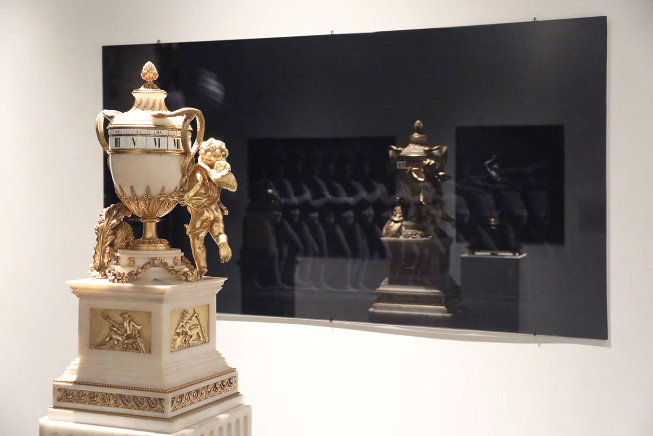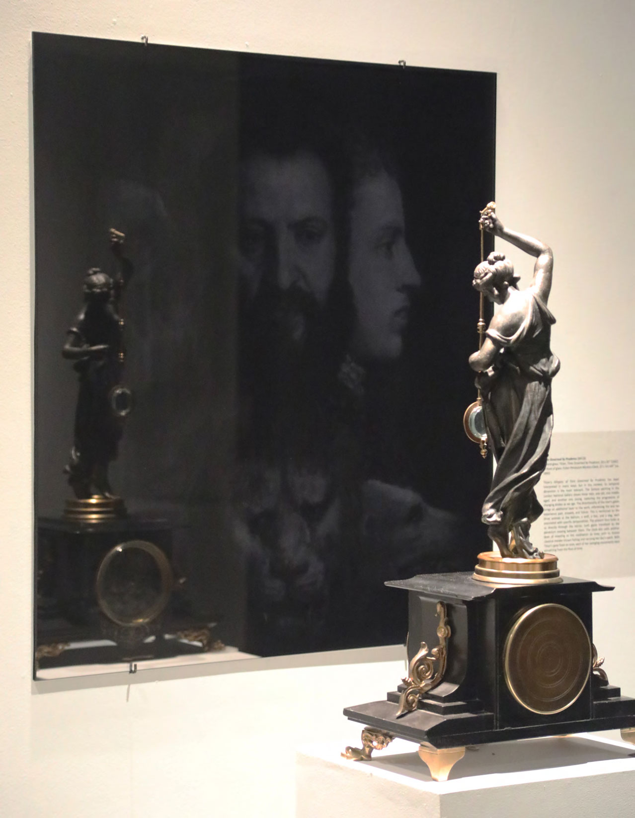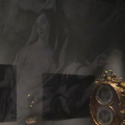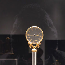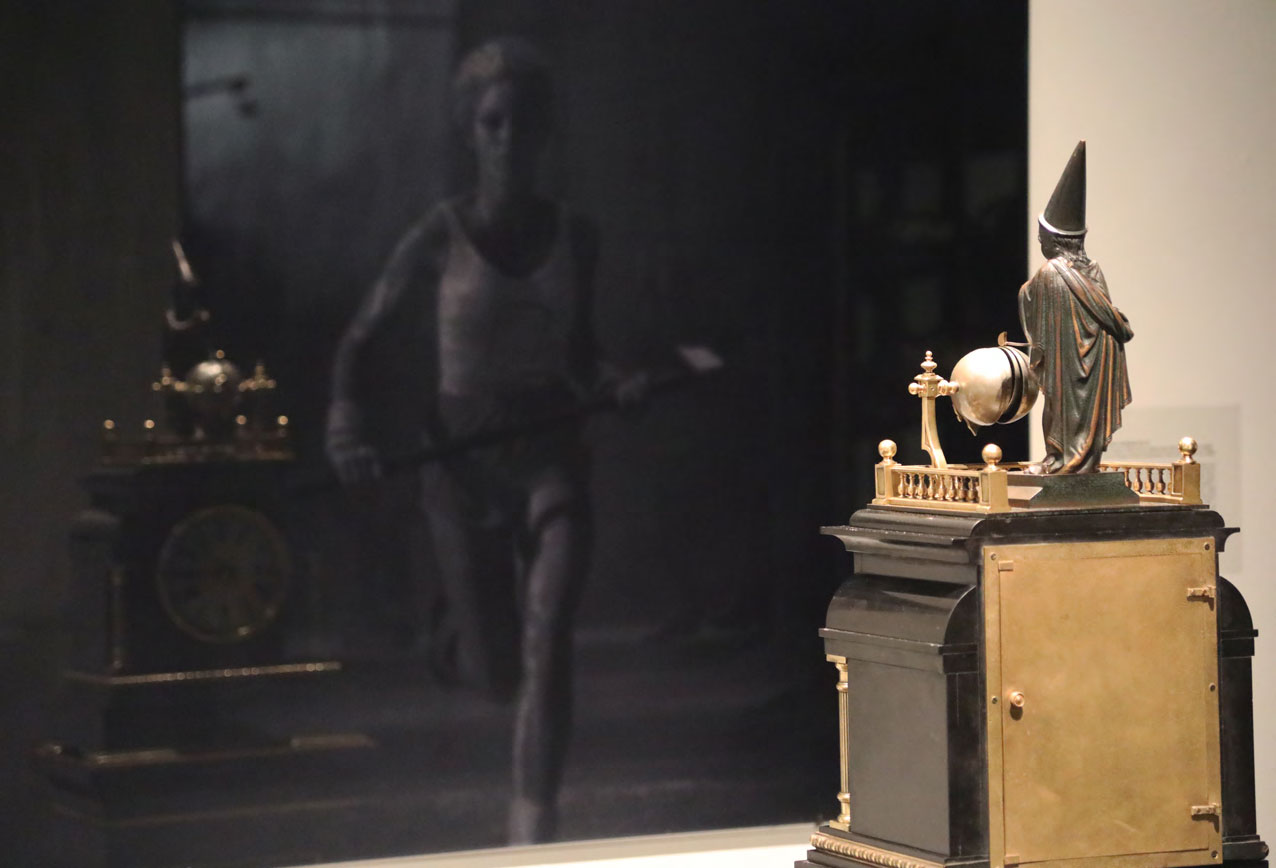 Reflections on Time (Black Mirror series) was created specifically for M.S. Rau, as part of the citywide Prospect.4 triennial. The installation juxtaposes eight 19th century clocks from M.S. Rau’s collection with Lasch’s Black Mirrors, metaphorically collapsing time. As viewers study their and the clocks’ reflections, ghostly images gradually emerge from the dark glass. These images depict unique representations of the concept of time from across history. Each mirror focuses on different areas of knowledge, including astronomy, painting, science, photography, and media. The setup allows the viewers’ image to merge with those of the mirrors, integrating stories across centuries and worldviews.