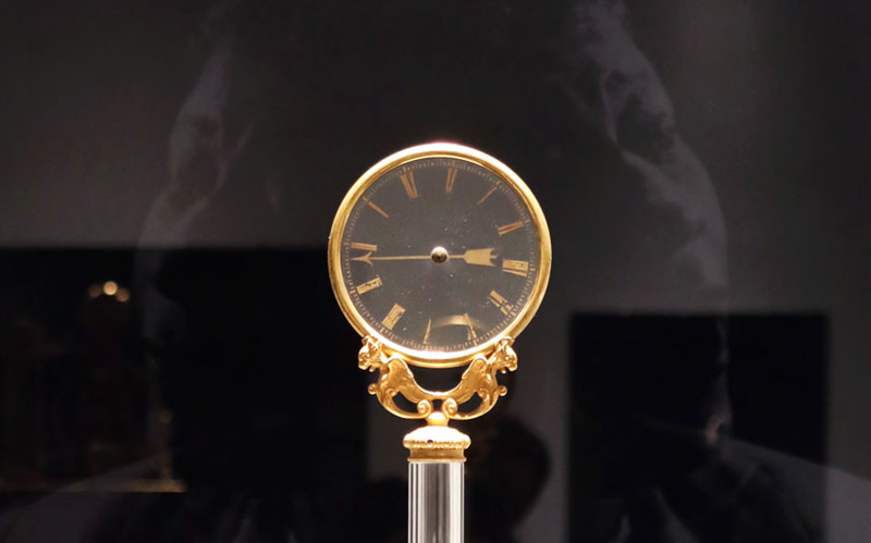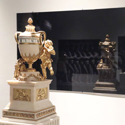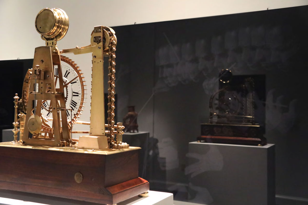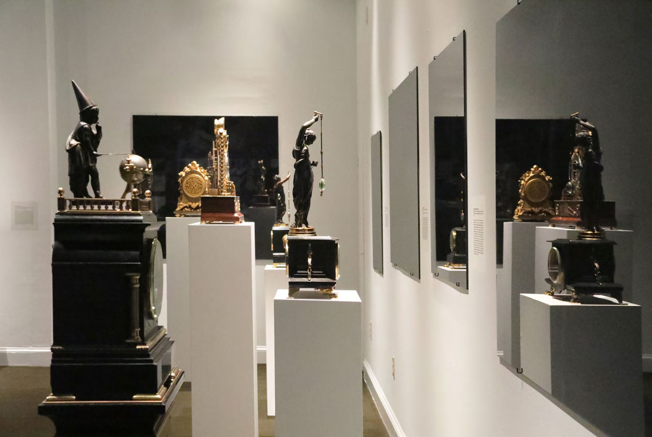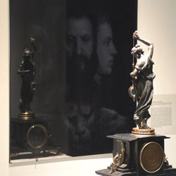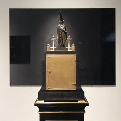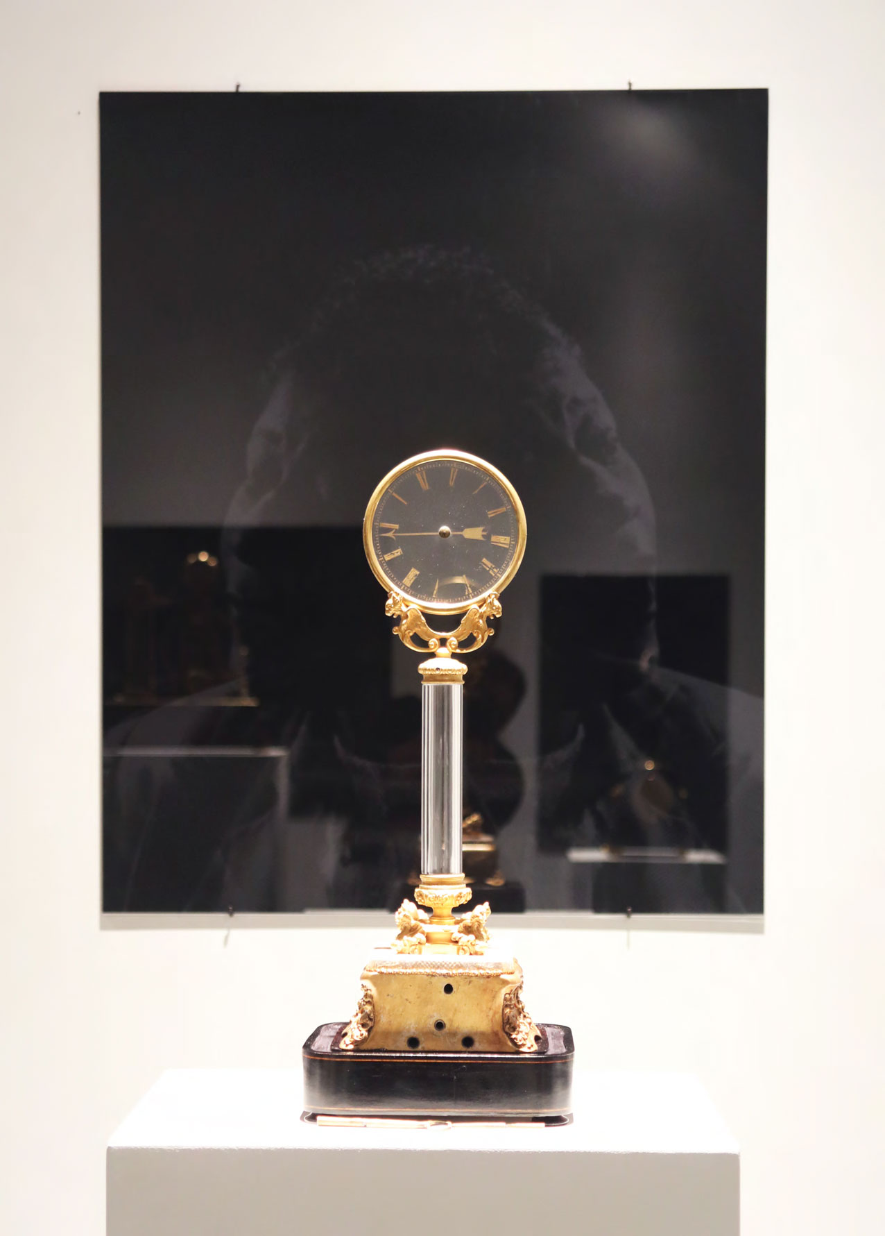 Reflections on Time (Black Mirror series) was created specifically for M.S. Rau, as part of the citywide Prospect.4 triennial. The installation juxtaposes eight 19th century clocks from M.S. Rau’s collection with Lasch’s Black Mirrors, metaphorically collapsing time. As viewers study their and the clocks’ reflections, ghostly images gradually emerge from the dark glass. These images depict unique representations of the concept of time from across history. Each mirror focuses on different areas of knowledge, including astronomy, painting, science, photography, and media. The setup allows the viewers’ image to merge with those of the mirrors, integrating stories across centuries and worldviews.